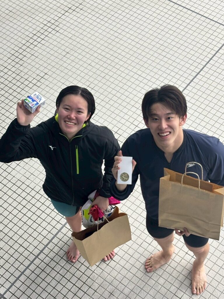⇩今大会の水泳部MVPの北村昂大(2年)と、副賞のヨーグルッペを貰って嬉しそうな久保田梨琉(OG)